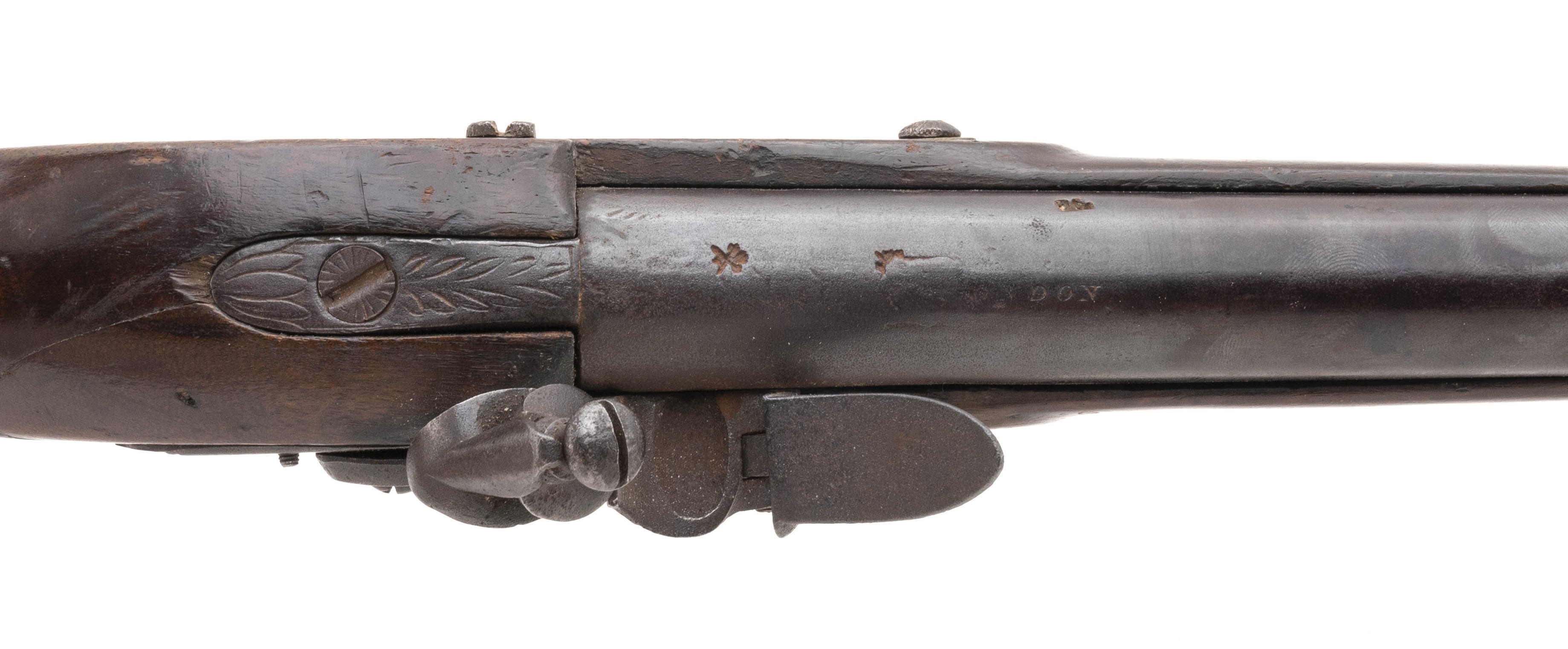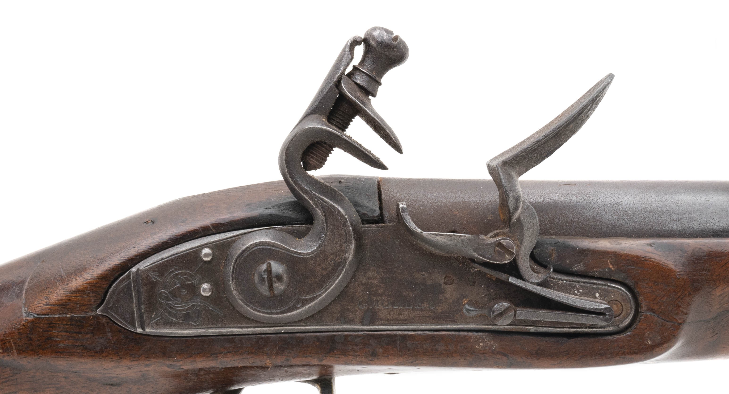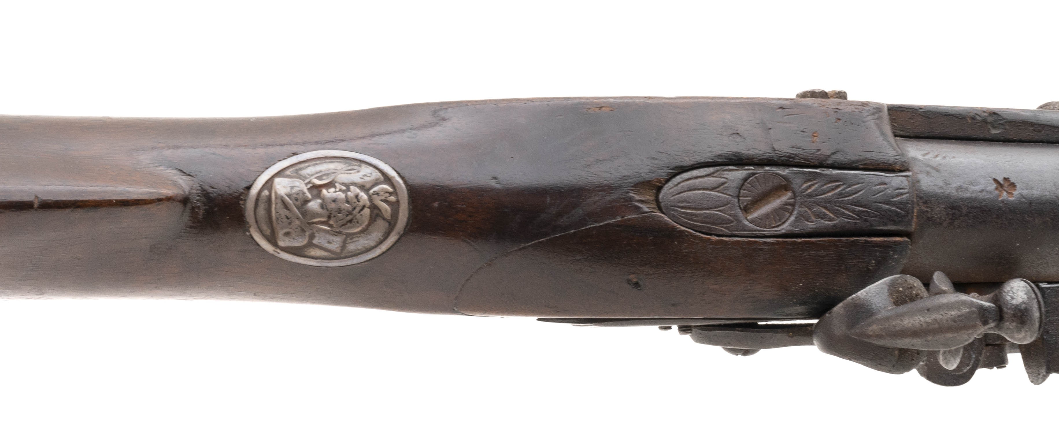 .66 caliber 37" round barrel flintlock Chief's Grade Trade Gun by Morley circa early 1800's in overall good condition. Metal is a dull grey patina with pin-prick oxidation present. German silver Indian Chiefs head is visible at the wrist. Wood is good with an old repaired crack right side above the lock plate. Lock plate is marked "G Morley" and barrel is marked "London with Birmingham proof marks noted. Action mechanically functions correctly, These guns were highly thought of by the Native Americans!