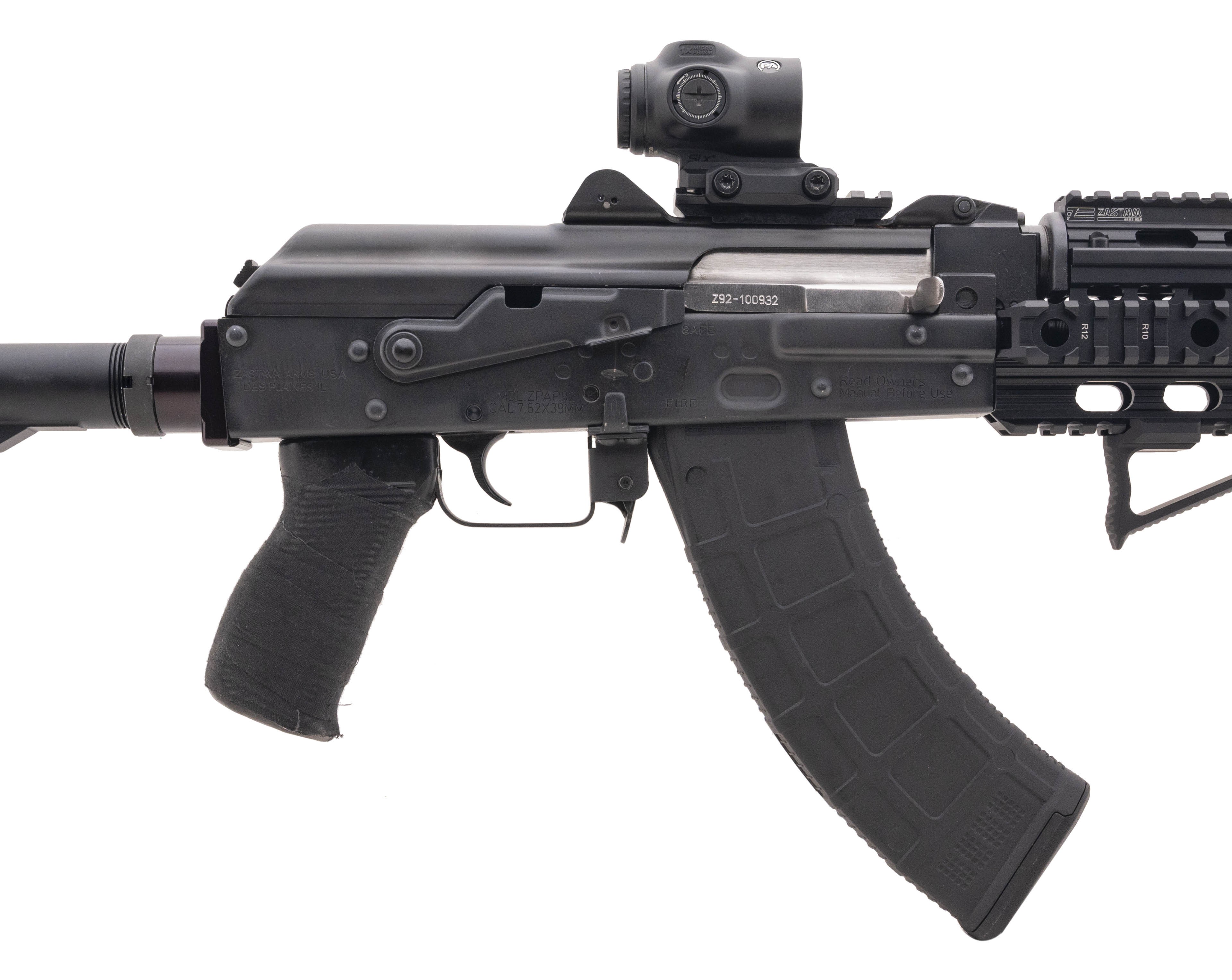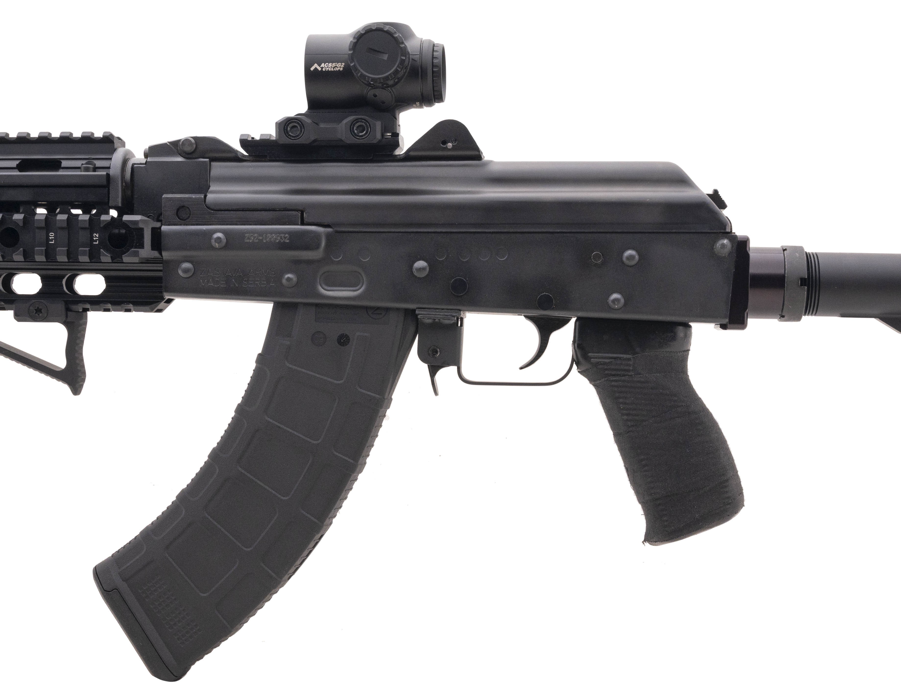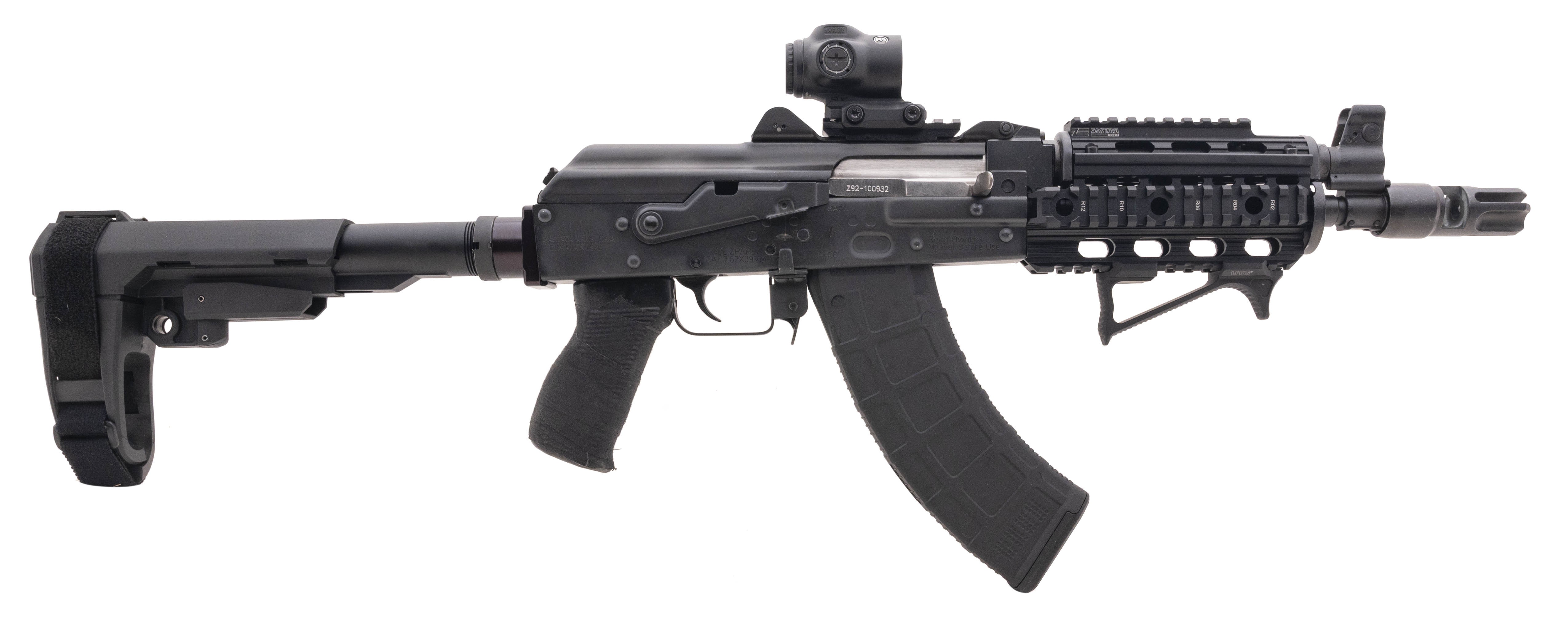 SN: Z92-100932. Semi-auto AK pistol with 10" barrel, quad rail, night brake, taped polymer grip and UTG angled grip. A SB tactical SBA3 pistol brace has been added and a Primary Arms ACSS G2 Cyclops red dot optic. Overall excellent condition. comes with box.