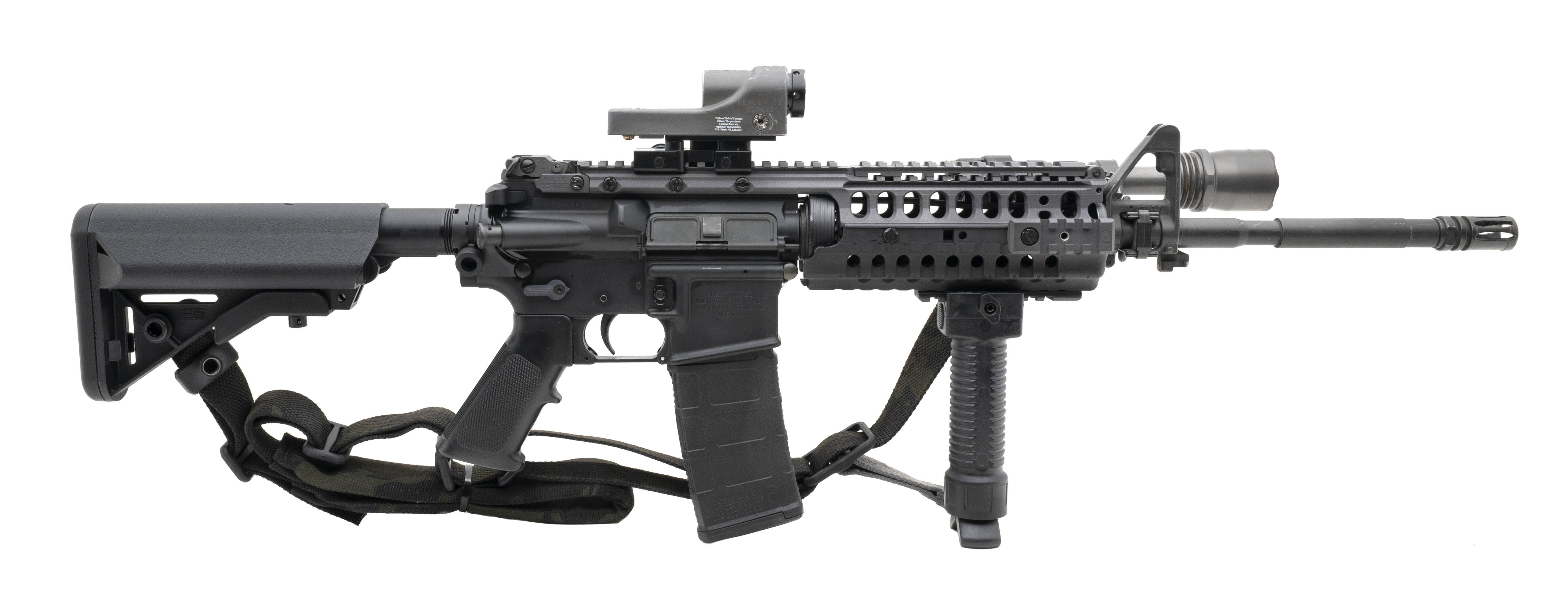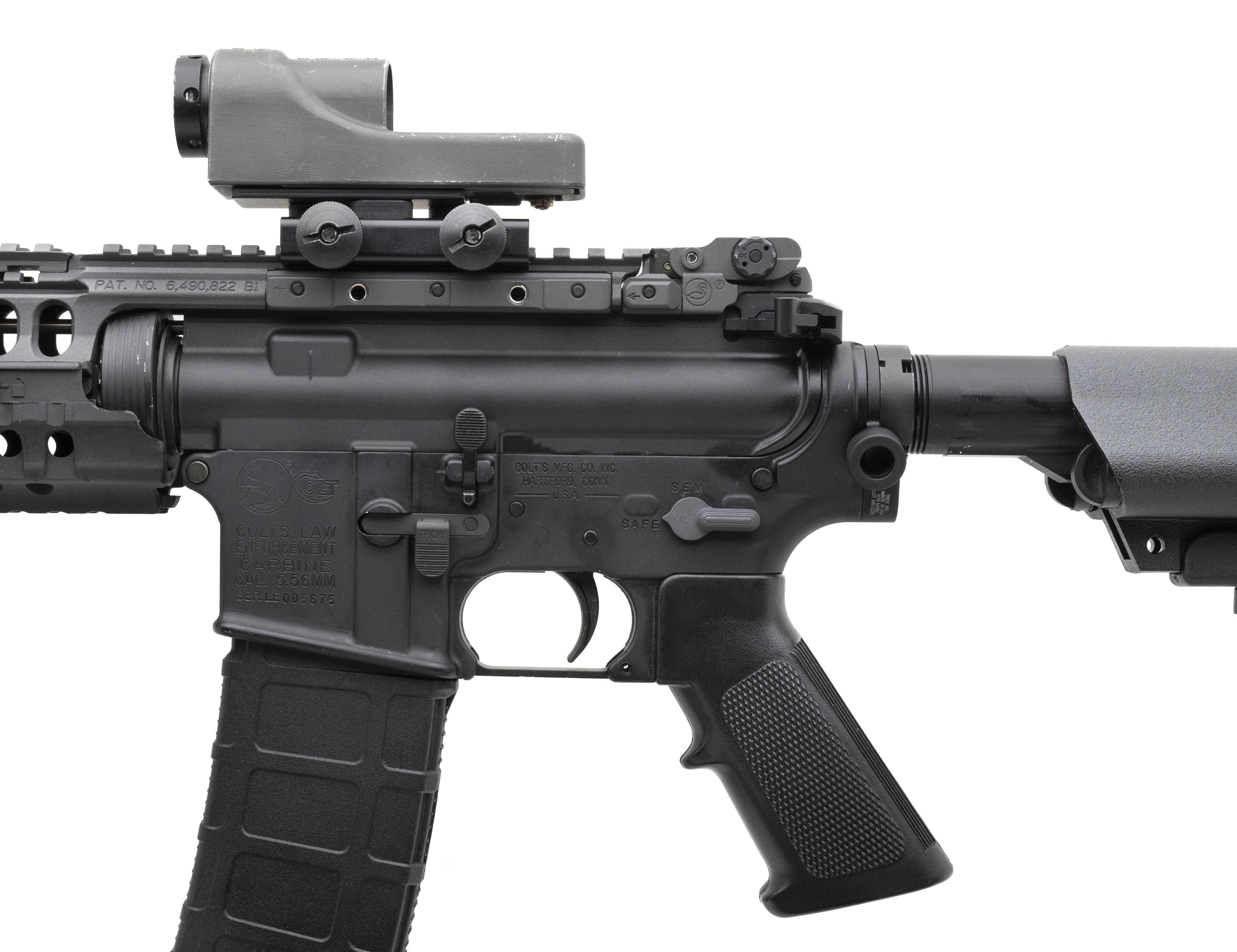 SN: LE005675. Colt tactical rifle with 16" barrel, Government/LEO marked lower, A.R.M.S. selective integrated rail, Troy ambi magazine release, Knights armament ambi safety, Troy OEM M4 sling mounts, BCM gunfighter charging handle, A.R.M.S. rear sight, Surefire M3 light, Trijicon riser and Trijicon ACOG Reflex II sight. Overall very good plus condition. Comes with sling.