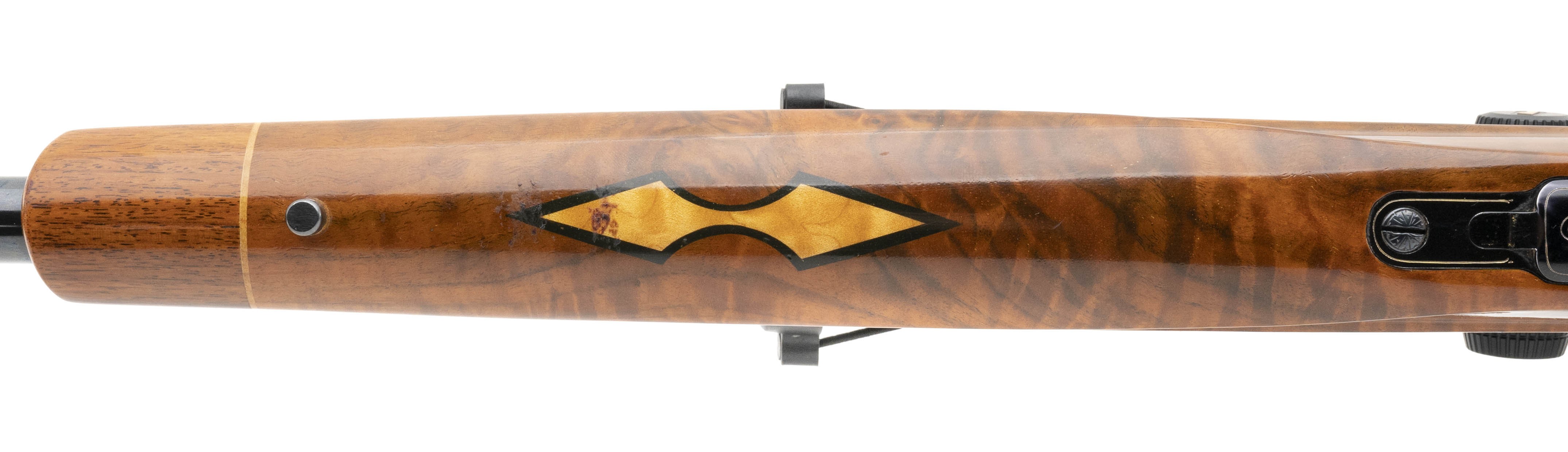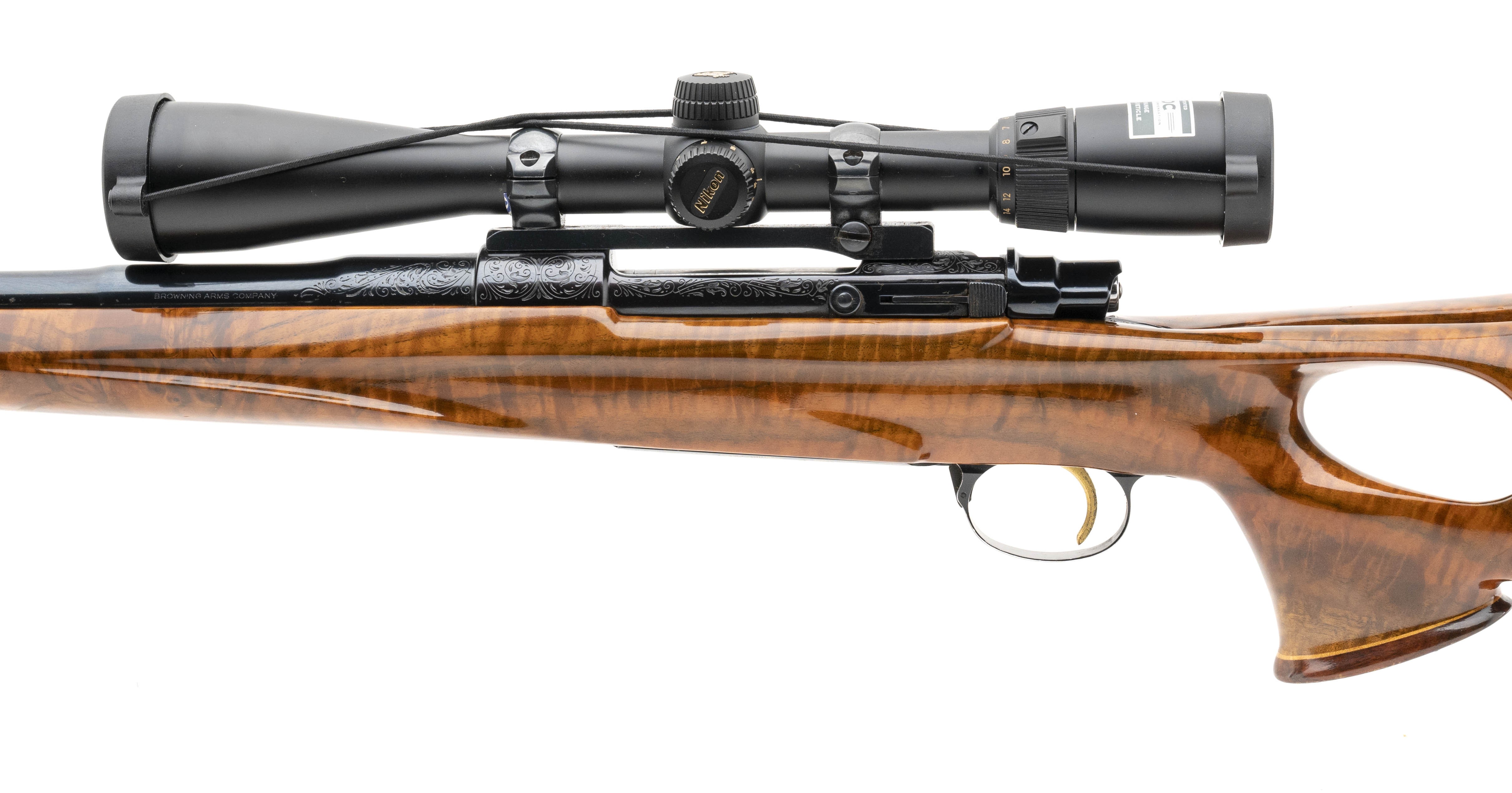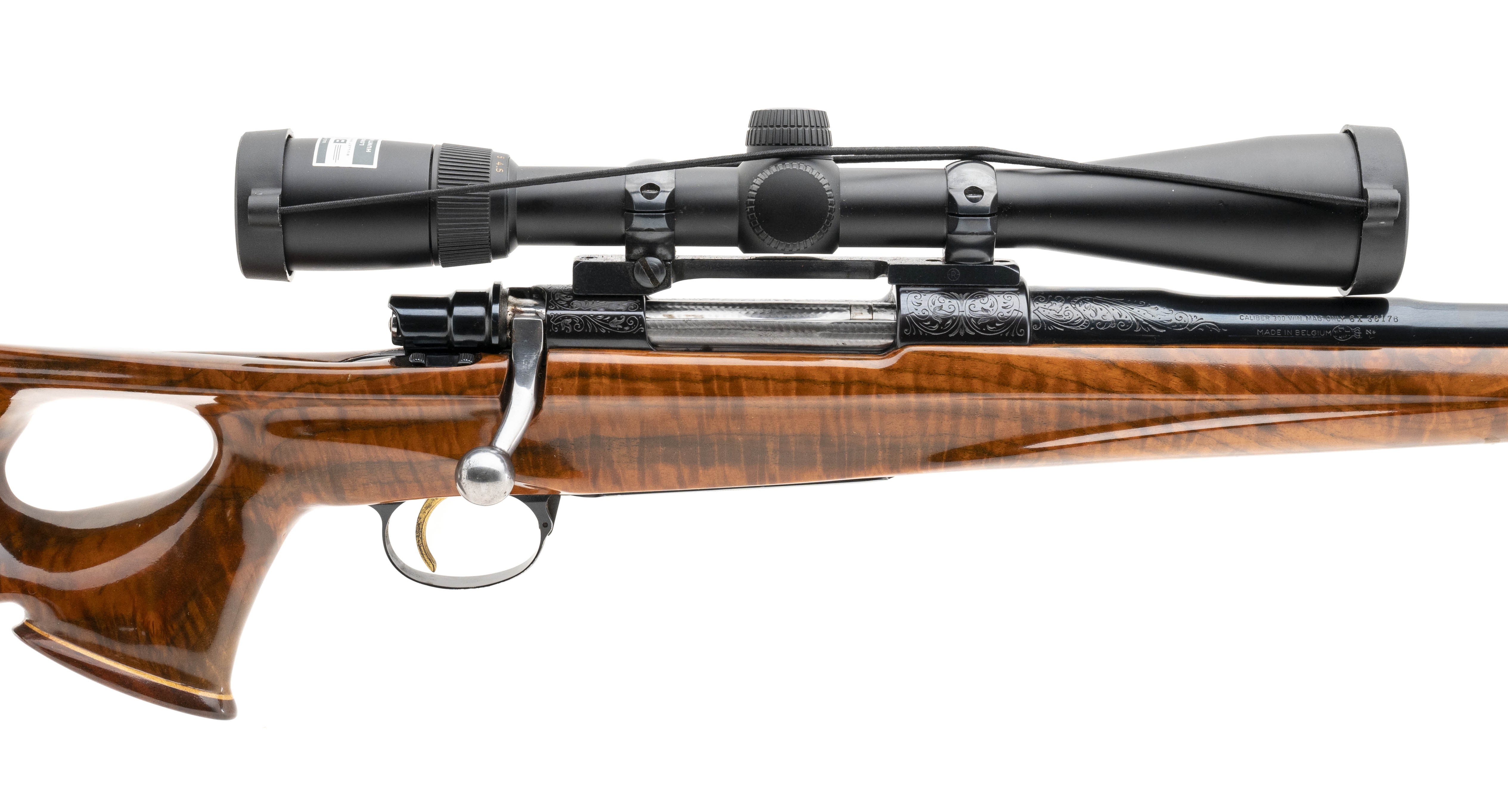 SN: 6X36176. Belgian made Medallion grade rifle customized by Harry Lawson. Has the classic Lawson thumbhole stock made of deluxe figured walnut and muzzle brake, with the factory engraving on the receiver and floor plate. A Nikon 4.5-14 scope is mounted. An outstanding custom rifle, in excellent condition.