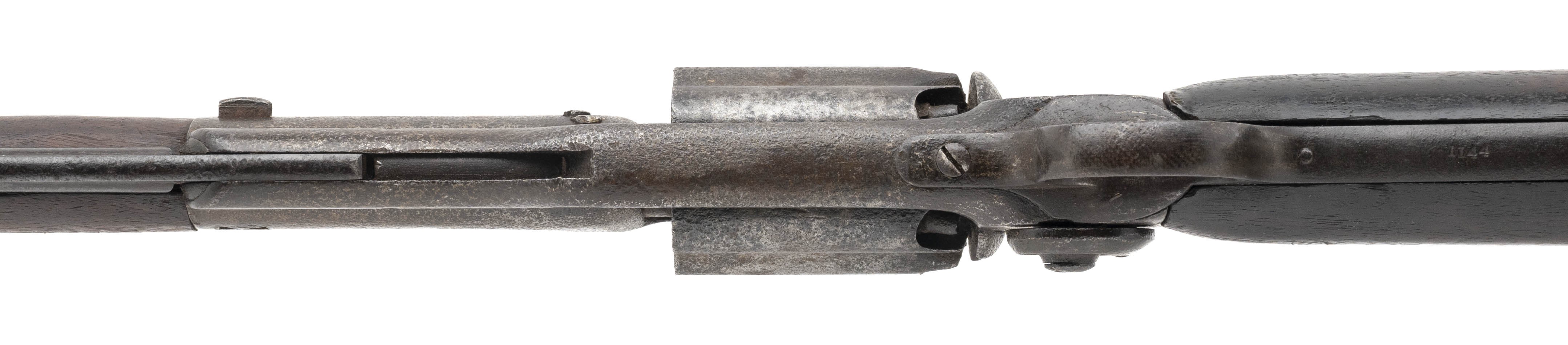 SN: 1144. Made circa early 1860s. 56 caliber with a 31 3/8” barrel. Metal has a dark brown to gray patina with scattered pitting throughout. Wood is very good with a faint cartouche on the left hand side.