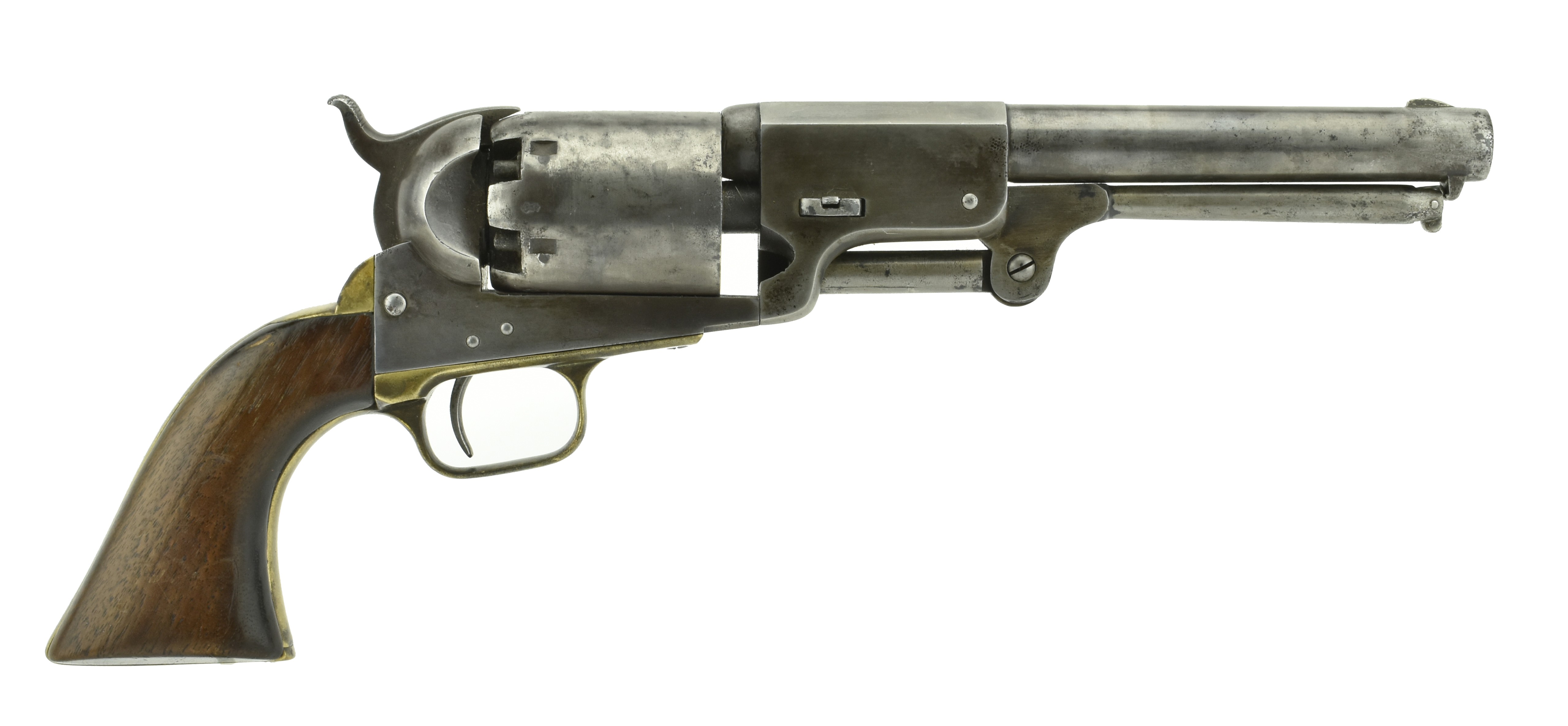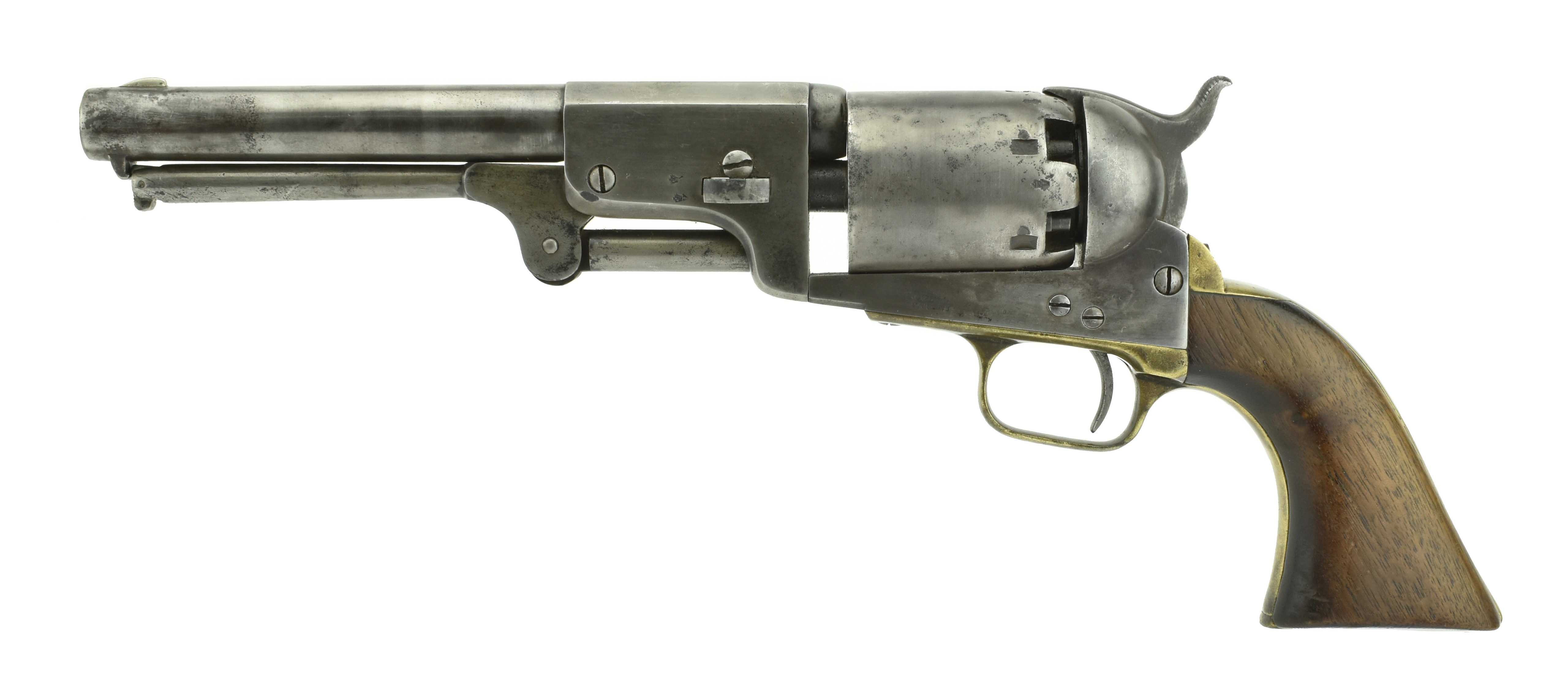 Colt 3rd Model London Dragoon. Made in 1853, .44 caliber with a 7 ½” barrel. This is one of the London guns that has a New York address. Metal has been cleaned and now has a dark gray patina. Gun locks up tight. All numbers match. Grips are very good. Action works well.