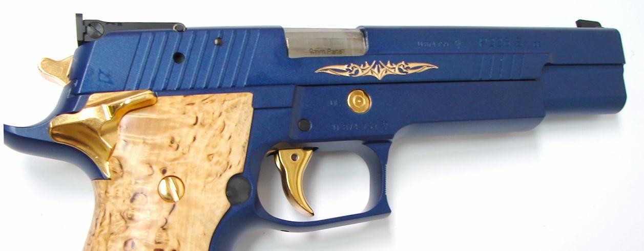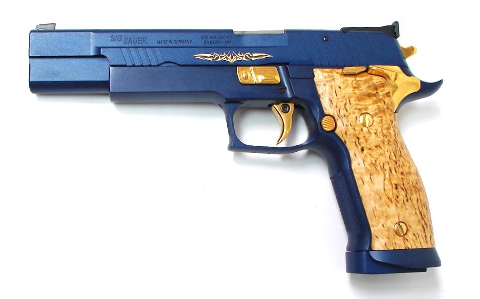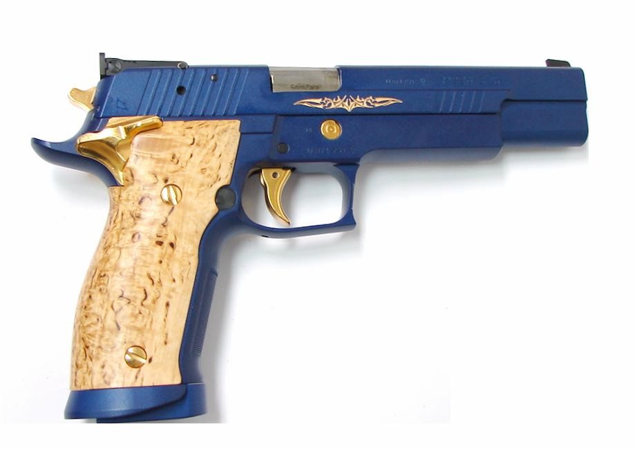 Sig Sauer X-Six Scandic 9 MM Para caliber pistol. X-Six Scandic model Mastershop Series Competition Target pistol with blue pearl finish and gold trim and fancy wood grips. New.