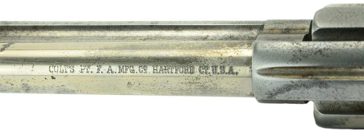 Colt Model 1878 double action revolver with etched barrel panel “Colt Frontier Six Shooter” which was a Colt trade mark for .44-40 caliber. The panel is about 60-70% visible. 7 ½” barrel. Bore has good rifling and light corrosion in the grooves. Action works perfectly. Gun has approximately 35-40% original nickel but the overall appearance is very eye appealing nice etched barrel .44-40.