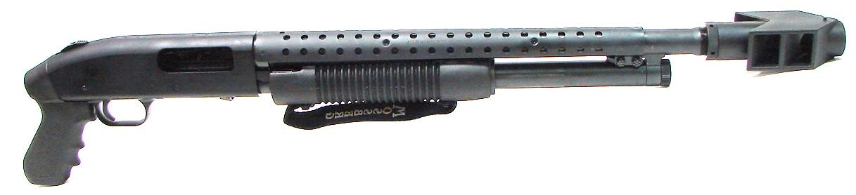 Mossberg 500 12 gauge shotgun. Pistol Grip Riot gun with muzzle brake that looks suitable for a tank. Neat!